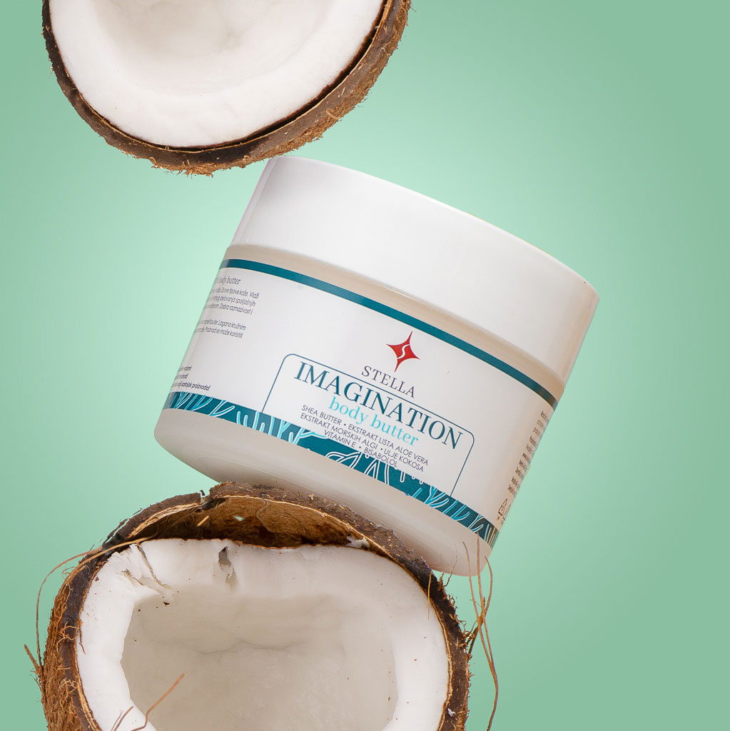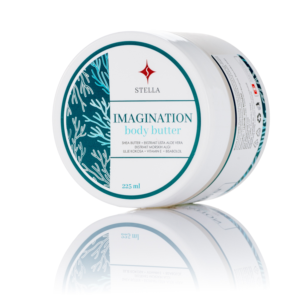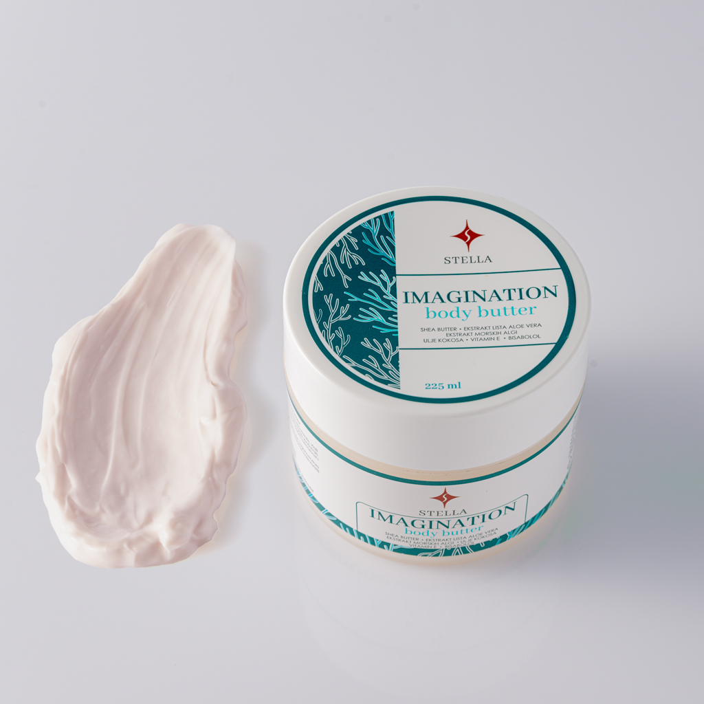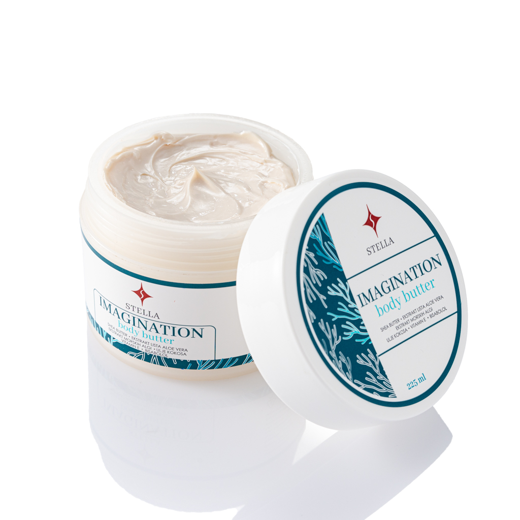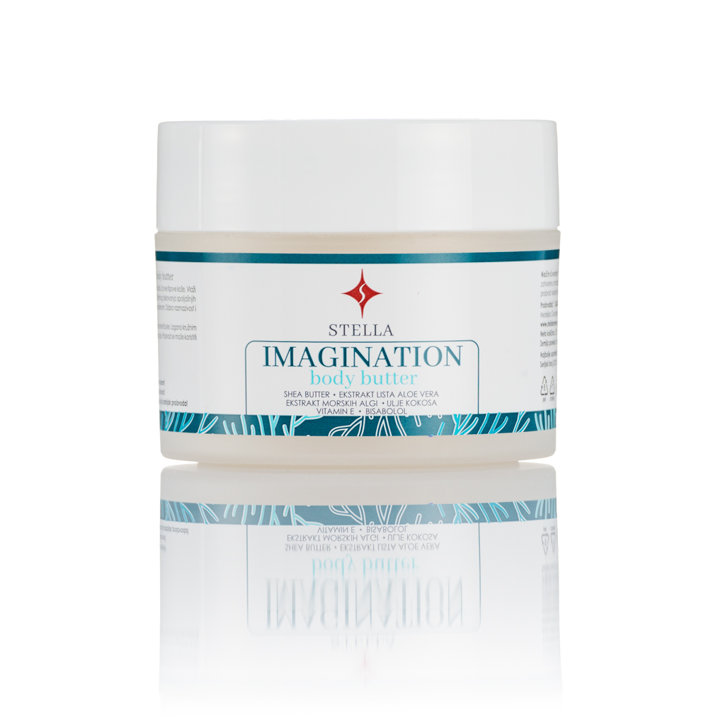 Koliko se puta desilo da zamišljate da ste na drugom mestu, na moru, u šumi, na ostrvu…daleko od svakodnevnice? Svaki put kada poželite da se u celosti prepustite tim mislima, preporučujemo vam da pružite svom telu šačicu Stella Imagination putera. Obećavamo da ćete osetiti trenutno osveženje. Sa idejom da vam pružimo mogućnost da se iz udobnosti doma teleportujete do vaše oaze mira, osmislili smo Stella Imagination Body Butter. Okrenuli smo se najboljem iz prirode. Birali smo mirise koji će vas osvojiti na prvo mazanje. Puter u svom sastavu sadrži visoku koncentraciju aktivnih sastojaka, među kojima su: Shea puter, ekstrakt lista Aloe Vera, ekstrakt morskih algi, ulje kokosa i vitamin E. Aloe Vera deluje protivupalno, antibakterijski, a zajedno sa Shea puterom održava prirodnu vlažnost, mekoću i elastičnost kože. Ekstrakt morskih algi je izvrstan biostimulator i efikasno potpomaže ishranu kože. Vitamin E usporava proces starenja kože.